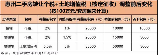 公告对“销售不动产”的个人所得税核定征收率进一步细化。其中个人(不包括个体工商户)转让二手住宅的个人所得税核定征收率调整为1%。据了解,目前惠州销售不动产个人所得税核定征收率为2%。调整后,意味着惠州个人转让二手住宅的个人所得税核定征收率减半。若按一套住宅房源总价1000万来计算,目前个税为20万元,政策调整后个税降至10万元,交易成本进一步降低。