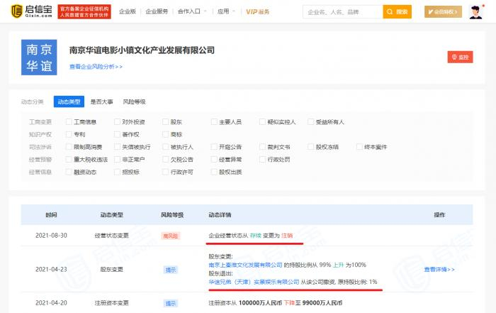 启信宝数据显示,南京华谊电影小镇公司已于2021年8月27日注销,华谊兄弟的退出时间为2021年4月19日。曾经出任南京华谊电影小镇公司董事的华谊兄弟副总秦开宇也已经于2019年5月31日离职。