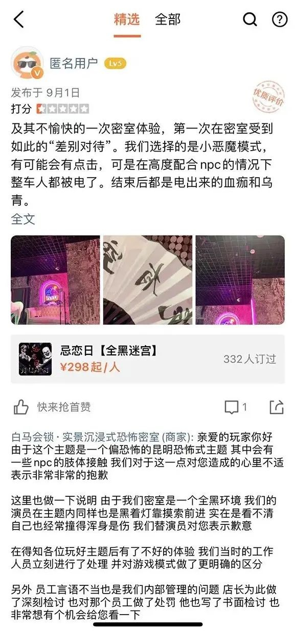 在一些密室的网上评价页面,甚至有玩家反映,在事先申明不要NPC用电棒电击或者肢体接触的情况下,最终被电出了血痂和乌青。