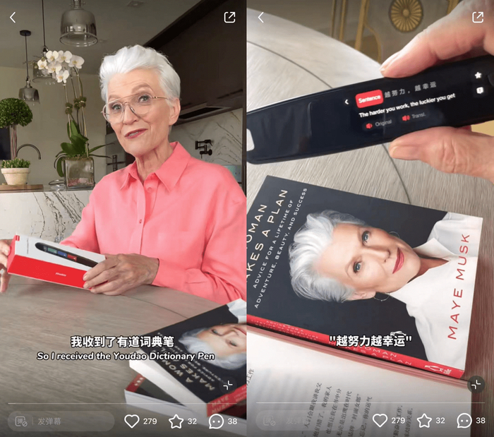 视频中,梅耶·马斯克正拿着有道字典笔扫描她的自传《人生由我》中文版的内容,轻轻一扫就可以识别并读出整句的内容,同时翻译成英文。翻译精准、产品便捷无不深深吸引了梅耶,视频最后她不吝惜对于有道词典笔的夸奖。