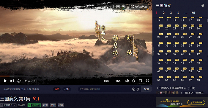银河长兴《三国演义》前两季在腾讯视频独播,播放量6.6亿,评分9.1