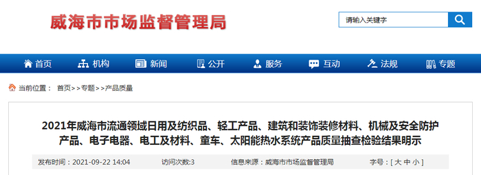中国质量新闻网讯 近日,山东省威海市市场监督管理局公示2021年威海市流通领域日用及纺织品、轻工产品、建筑和装饰装修材料、机械及安全防护产品、电子电器、电工及材料、童车、太阳能热水系统产品质量抽查检验结果。