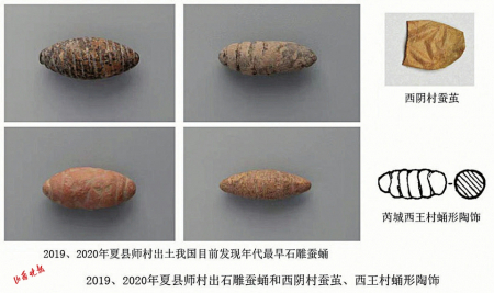 2019年至2020年,吉林大学考古学院、山西省考古研究所、运城市文物工作站等单位联合对夏县师村遗址进行了调查与发掘,取得了重要收获,其中就有距今6000年前的4枚仰韶早期的石雕蚕蛹,这是我国目前发现年代最早的石雕蚕蛹形象,可以说是中华文明的重要标识。