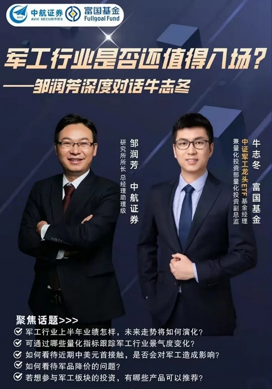 国防军工板块一直备受投资者关注。9月16日下午,中航证券研究所所长(总经理助理级)邹润芳,与富国基金中证军工龙头ETF基金经理、兼量化投资部投资副总监牛志冬,就“军工行业是否还值得入场”话题进行了深入探讨。