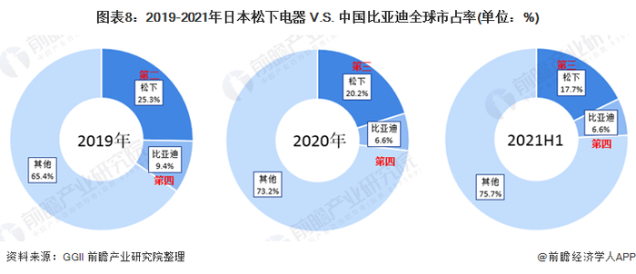 2021年上半年, 松下电器的市占率为17.7%,位列全球第三,比亚迪的市占率为6.6%,位列全球第四。