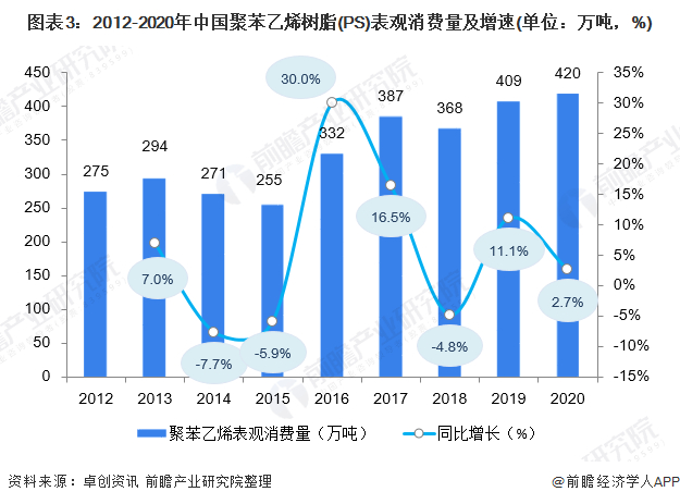 随着国民经济和石油化工的发展,中国PS生产规模不断扩大,产量不断增加。但是生产量还远不能满足需求。2020年,中国聚苯乙烯树脂(PS)表观消费量为420万吨,同比增长2.7%。