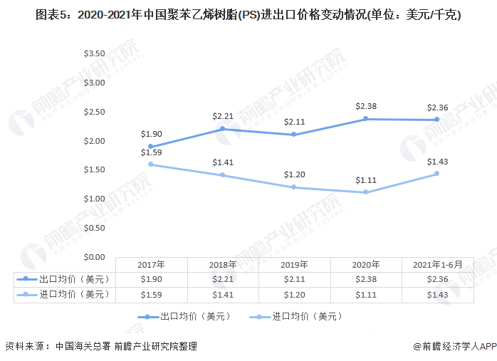 根据海关总署统计数据显示,2017-2020年我国聚苯乙烯树脂(PS)进口的进口均价呈下降趋势,2020年国聚苯乙烯树脂(PS)进口均价为1.11美元/千克;然而2021年1-6月,聚苯乙烯进口均价上升至1.43美元/千克。从我国聚苯乙烯出口均价来看,2017-2020年,聚苯乙烯出口价格整体呈波动上升的趋势,2020年聚苯乙烯出口均价为2.38美元/千克。然而2021年1-6月,聚苯乙烯出口均价为2.36元,同比有所下降。