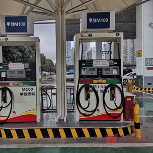 西安北三环外的一处甲醇加注站,是向峰每天工作的地方。远远看过去,这里与普通加油站的外观并无不同。但如果走近看,就能发现这里除了汽、柴油加油机,还有两台四枪M100甲醇加注机,上面醒目的标注着“M100甲醇燃料”。