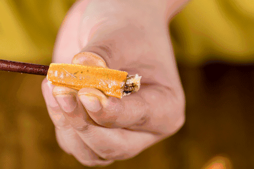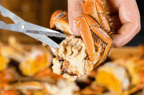 其次,在吃河蟹时,由于蟹腿太硬,不建议用牙咬(太废牙),可以拿把剪刀,把蟹腿剪下来,然后如图所示的那样,用筷子细的一头,轻轻一捅蟹腿肉就出来了!蟹钳同样也可以用剪刀一剪两半,安心吃里面的蟹钳肉!