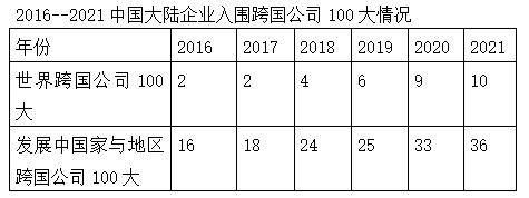 9月25日,中国吉林网获悉,中国企业联合会、中国企业家协会推出2021中国100大跨国公司分析报告。