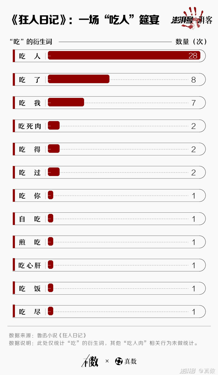 《狂人日记》中,有12个与“吃”相关的动作,这些动作一共出现了55次,“吃人”一词使用了28次,独立成词的“吃”出现了15次。