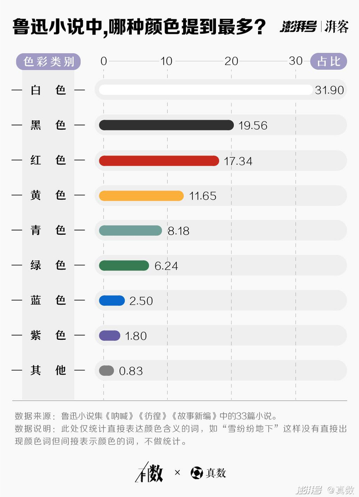经统计,鲁迅的《呐喊》《彷徨》《故事新编》三部小说集的33篇小说中,使用的颜色词达76种,共使用721次,不仅涵盖了黑、白、红、黄、蓝、绿这六大类与人类生活密切相关的基本颜色词,还以基本色为焦点运用到花白、青白、土黄、橙黄、桃红、肉红、灰绿、石绿等具体的色彩层次上。数据统计发现,鲁迅小说语言中使用最多的颜色为白、黑、红,分别占31.90%、19.56%、17.34%。