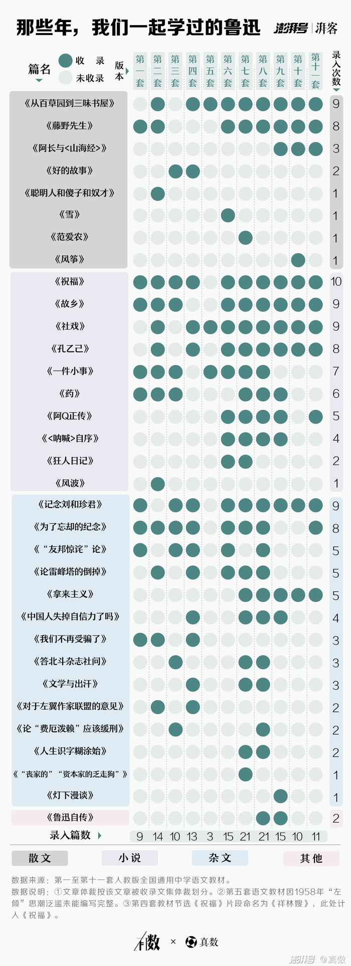 当前使用的人教版中学语文教材中,鲁迅的文章数量为11篇,仅为最多收录时期(第7套和第8套)21篇的一半,但保留的大多是《祝福》《故乡》《社戏》《记念刘和珍君》等历套教材中收录次数最多的、最为经典的篇目。从这些文章中,当代青少年仍然能够从作品中体会到语言的深厚,看到百年前文豪的身影与精神。