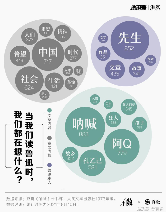 我们对豆瓣上《呐喊》书评的540条共52万字长书评进行收集、分词,筛选无意义词语后提取高频词汇。