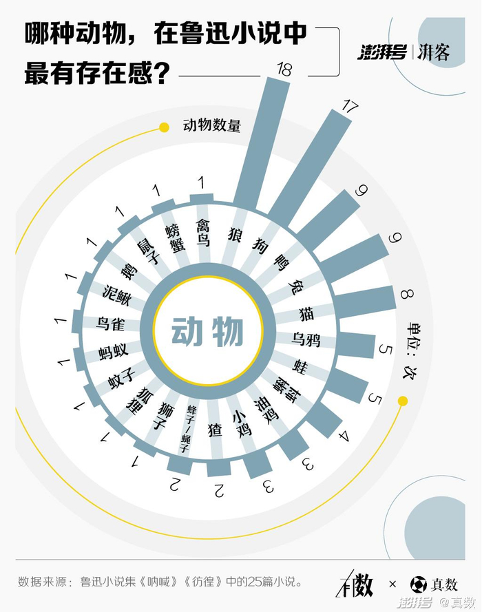 在《呐喊》《彷徨》的25篇作品中,“狼”和“狗”的意象出现最多。涉及“狼”意象的小说篇目有6篇,共18处,涉及“狗”意象的有9篇,共17处。