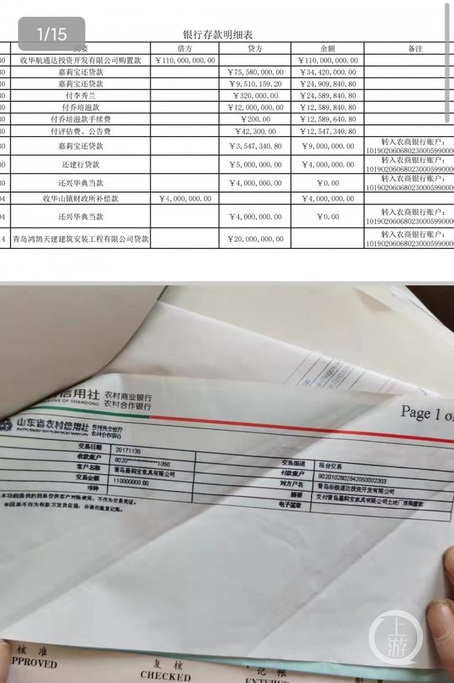 2017年11月30日,华航通达公司向嘉莉宝转账1.1亿元,汇款用途为“支付嘉莉宝公司厂房土地款”。入账青岛农商银行即墨支行后除支付贷款外,其他数千万元在嘉莉宝公司不知情的情况下被该支行私下多次划转。图片来源/受访者供图