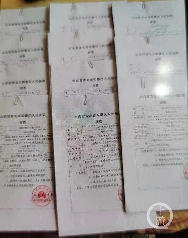 2021年3月26日,即墨区法院、青岛市中院一天之内连续给解本正及其家人发送154封传票且全部是4月8日开庭。图片来源/受访者供图