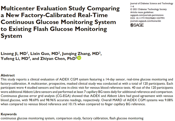 近日,由北京大学人民医院牵头,北京医院、北京大学第一医院和北京市平谷区医院参与完成的评价一款中国自主研发生产的14天工厂校准实时持续葡萄糖监测系统AiDEX CGMS的临床研究结果《Multicenter Evaluation Study Comparing a New Factory-Calibrated Real-Time Continuous Glucose Monitoring System to Existing Flash Glucose Monitoring System》(一款新工厂校准实时葡萄糖持续监测系统与现有扫描式葡萄糖监测系统对比的多中心研究),正式在美国糖尿病技术学会的官方刊物《Journal of Diabetes Science and Technology》(糖尿病科学与技术)期刊上发表。