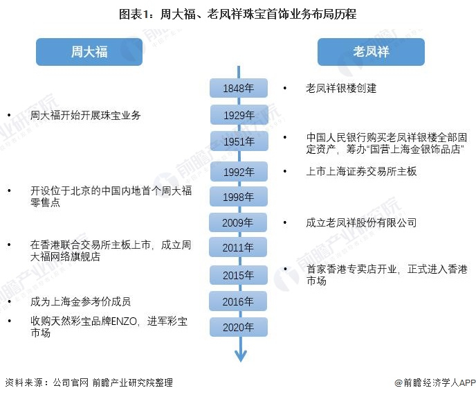 周大福和老凤祥作为我国珠宝首饰行业港资企业和内资企业的代表,多年来始终处于行业龙头地位,两家企业珠宝首饰业务的布局历程如下: