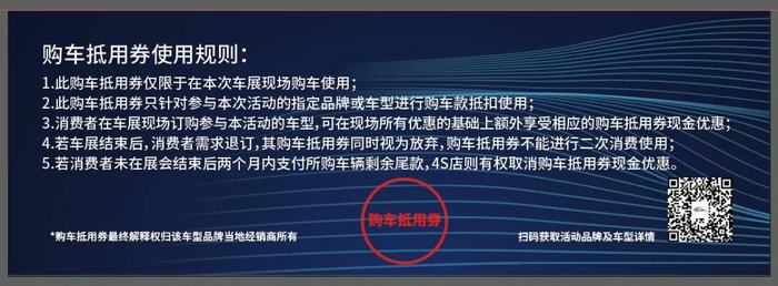 第一重优惠为组委会联合各参展汽车品牌共同打造的购车抵用券活动。针对车展期间的购车用户,部分汽车品牌给可享受到全系或部分车型在自己所谈价格的基础上额外享受1000元或2000元的价格优惠政策。