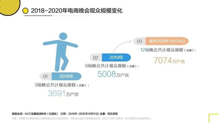同时,电视的渠道能让网络电商平台触达到更多下沉市场的用户。根据NCC海量融源收视数据显示,2018年至2020年,电商晚会累计观众规模增长了41.3%,大量的电视受众正在通过这一渠道接触直播带货。