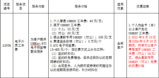 十一、降低对公安全认证工具工本费,删除普通对公USBKEY;蓝牙USBKEY工本费,对所有对公客户按成本价收取,银企直联专用USBKEY免费向客户提供,以上项目优惠期限为3年。具体如下: