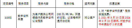 十、降低数字证书年费,对所有对公客户实行5折优惠,优惠期限为3年。具体如下: