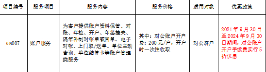 五、降低银行账户开户手续费,对所有对公客户在我行开立单位结算账户开户手续费实行5折优惠,优惠期限为3年。具体如下: