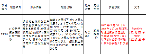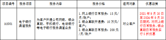 为贯彻落实四部委《关于降低小微企业和个体工商户支付手续费的通知》(银发〔2021〕169号)的工作部署,积极响应监管部门相关倡议,并努力承担社会责任,我行拟自2021年9月30日起对所有对公客户降低支付手续费。根据《商业银行服务价格管理办法》(中国银监会 国家发展改革委令2014年第1号)的规定,现将调整后的服务项目及服务价格予以公示如下: