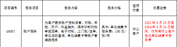 二、降低银行账户服务收费,在前期已对所有对公客户免收单位结算账户管理费和年费的基础上,本次对所有对公客户免收单位结算卡服务费,优惠期限为3年。具体如下: