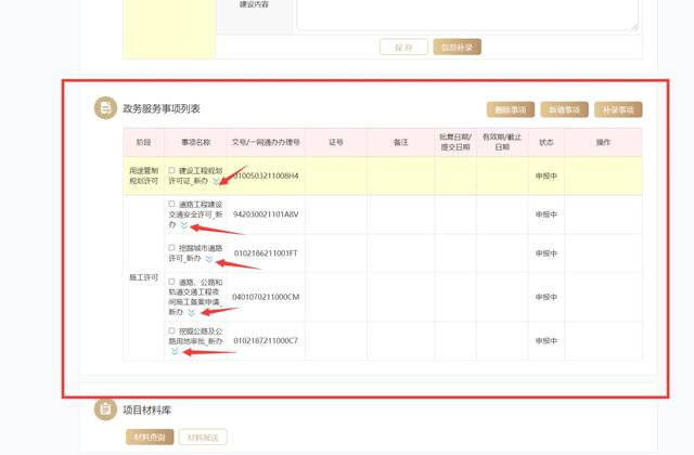 在页面中“政务服务事项列表”中展示的便是该一件事涉及的事项列表。点击箭头所指的按钮,会展示所有单事项目前的办理进度。