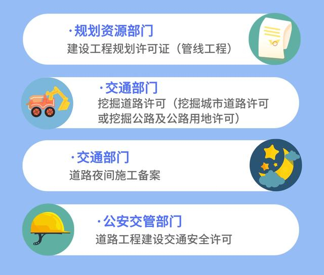 该“一件事”涉及规划资源部门的“建设工程规划许可证(管线工程)”、交通部门的“挖掘道路许可(挖掘城市道路许可或挖掘公路及公路用地许可)”和“道路夜间施工备案”,以及公安交管部门的“道路工程建设交通安全许可”4个事项。