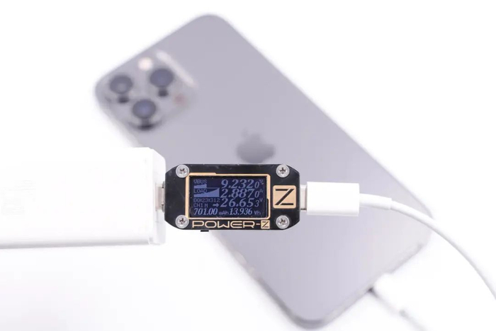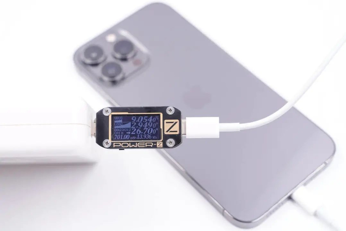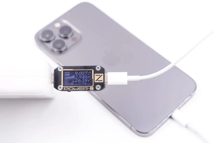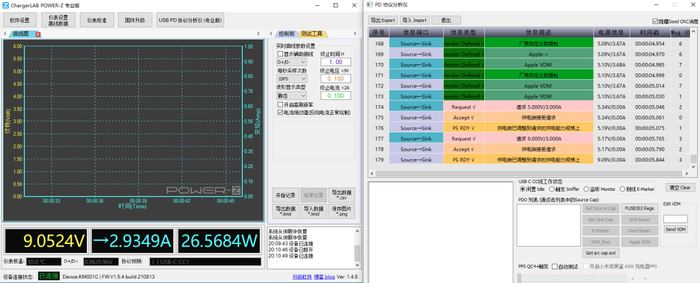 使用苹果96W PD充电器通过C to Lightning快充线连接到iPhone 13 Pro Max,然后使用ChargerLAB的POWER-Z KM001C连接到充电器与线材,最后接到电脑的POWER-Z上位机,在经历了一系列的快充握手后最终手机向充电器请求9V3A PD快充档位,充电功率为9.05V 2.93A 26.56W。