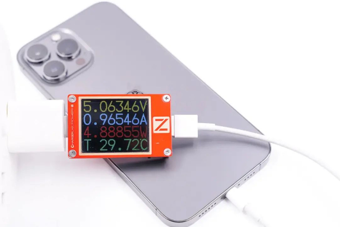 苹果20W PD充电器最初于2020年iPad Air 4发布会上亮相,支持9V2.22A 20W PD快充,使用充电器为iPhone 13 Pro Max充电,功率为8.98V 2.16A 19.49W。