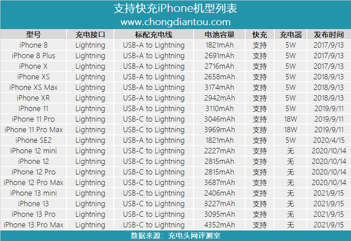 据充电头网统计,目前iPhone已有18款机型支持PD快速充电,其中自去年的iPhone 12系列开始苹果不再为iPhone标配充电器,用户如果想要使用快充,需要另购苹果20W PD充电器。