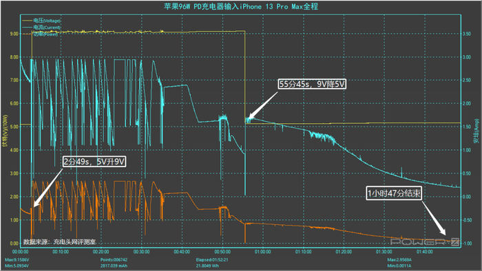 55分45s时电压由9V降至5V,功率在8W左右,于1小时47分充电结束。整个测试过程中峰值功率为9.05V 2.93A 26.60W。