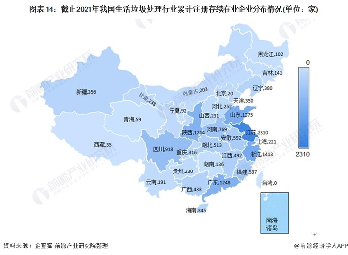 根据本报告对于生活垃圾处理行业归属国民经济行业分类定义,前瞻对企查猫在生活垃圾处理行业注册企业数据进行筛选,截止2021年9月13日,我国生活垃圾处理存续和在业企业累计15712家。从分布来看,我国生活垃圾处理行业注册企业最多省份为江苏省,累计注册企业2310家,其次为浙江省,累计注册企业1413家。除去东部沿海地区,中西部地区四川省和陕西省累计注册企业也较多,分别为1214家和918家。