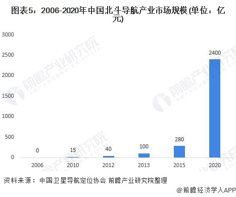 2006-2020年我国北斗导航产业从无到有,2015年以来得益于北斗三号系统的逐渐部署完善,产值大幅增加。根据《国家卫星导航产业中长期发展规划》,北斗导航市场规模占到卫星导航产业市场规模的60%,重要应用领域达到80%以上,测算得出2020年北斗导航产业达到2400亿元左右的市场规模。