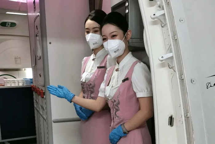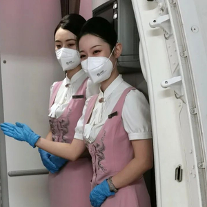 吉祥航空乘务员迎接旅客登上纪念航班(记者钱擘/摄)“今天是个特殊的日子。”