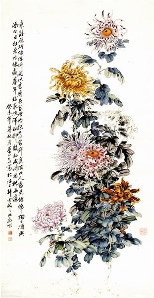 1943年,萧心泉创作《秋菊图》,图绘七朵菊花,分大小二枝,黄、紫、粉、白、朱五色菊花灿烂交辉。细瓣秋菊以长线双钩而成,提按间蕴篆隶意,曲尽其态。从花心到花瓣、花托、花叶、花枝,菊叶卷曲伸展,得其自然,秀丽雍容。以水色铺陈为主,局部辅粉彩点染。菊叶一组一丛,依次用没骨施草绿,背光处略染玄色,从里到外,从明到暗,从冷色到暖色,渐次变化,过渡微妙。整幅画,花叶互映,枝芽依衬,野趣横生,主体菊花的秀丽清奇,跃然楮素之上。画面左侧题有长跋,以抒心迹:“东篱采得倍堪怜,开供书斋袅篆烟。冷抱冬心客寂寞,淡如人意更缠绵。陶公酒与添今日,杜老吟怀感暮年。拈取渔洋秋柳韵,助成诗思枕函边。”