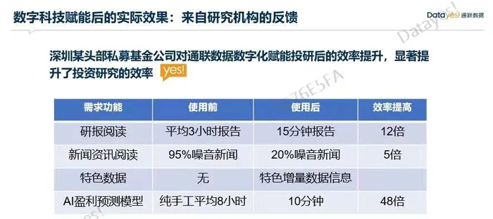 据深圳某头部私募反馈,在使用通联数字化赋能投研后,显著提升了投研效率,尤其AI迎来预测模型,以前纯手工平均需要8小时,模型则仅需10分钟,效率提高了48倍。