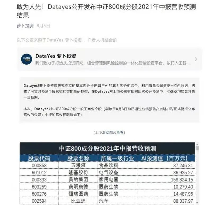 8月5日,通联数据旗下DataYes!萝卜投资平台向市场公开发布了针对中证800成分股2021年上半年营收的预测结果,剔除8月5日前已通过业绩快报等方式披露营收情况的公司后,有效公司为612家。这已经是公司连续第二年提前一个月向市场发布人机结合的AI盈利预测结果,也是业内少数敢于向市场公开求证模型准确度的机构。