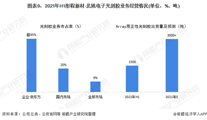 在面板光刻胶领域,公司子公司-北旭电子也与2021年上半年实现收入1.2亿元,Array用正性光刻胶产品出货1500吨,同比增长22%,其产品在国内最大面板客户京东方的占有率超45%,国内市场占有率近20%,全球市场占有率约9%。同时,随着Halftone产品的突破,产品已覆盖TFT-LCD面板所有层,随着产能的释放和新产品开拓,预计2021年全年出货将超过3000吨,下半年北京北旭光刻胶产品的市场占有率将进一步提升。