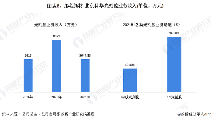 从光刻胶业务经营业绩来看,2016-2020年,公司子公司-北京科华光刻胶业务收入由5613增长至8929万元,年均复合增速达12%;2021年上半年,北京科华光刻胶业务收入达5647.83万元,同比增长46.7%,其中G/I线光刻胶同比增长40.4%,KrF光刻胶同比增长94.5%: