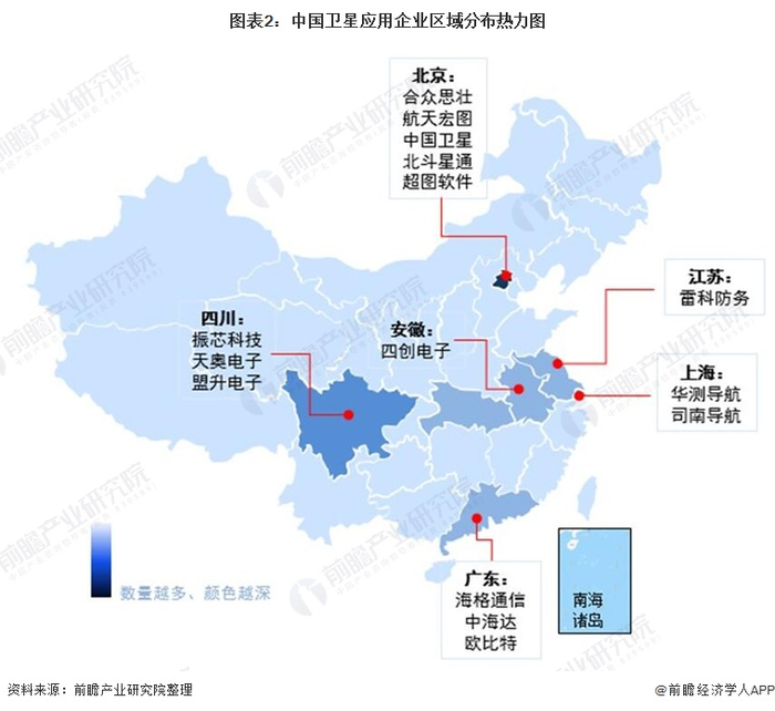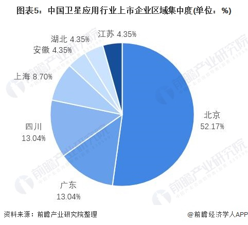 从区域分布来看,卫星应用企业分布较多的省份主要有北京、江苏、上海、安徽、广东、四川等。其中北京企业分布最为集中,共拥有12家上市企业。
