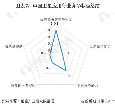 从五力竞争模型角度分析,目前,我国卫星应用行业在导航、遥感、通信领域具有举足轻重的地位,替代品威胁较小;现有竞争者数量较多,市场集中度较低,竞争程度较为激烈;上游卫星制造、卫星发射企业多为技术密集型国有企业,且数量较少,议价能力较弱;下游应用市场则由于市场参与者众多,竞争激烈,议价能力一般;同时,由于卫星应用行业技术含量高、生产周期长,高门槛且高投入,限制了外部竞争者的进入,尽管国家目前对卫星应用行业市场准入限制放宽,但短时间内行业潜在进入者威胁仍然较小。
