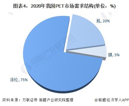 聚酯PET主要应用为聚酯瓶片、聚酯纤维以及聚酯薄膜三大块,其中聚酯纤维又分为涤纶长丝以及涤纶短纤,用量约占整个聚酯产量的75%,它们主要用于纺织业:聚酯瓶片的占比约为20%,主要用于食品饮料的包装;聚酯薄膜约占5%,主要用于外层材料,具有较好的印刷性。