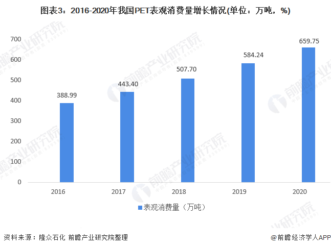 2016-2020年,我国PET表观消费量呈现逐年增长的态势。2020年,我国PET表观消费量为659.75万吨。不过,我国PET表观消费量增速均在2019年开始放缓,其主要原因是我国PET在2018年集中爆发后开始出现了产能过剩的问题,因此厂商在减少新增产能。