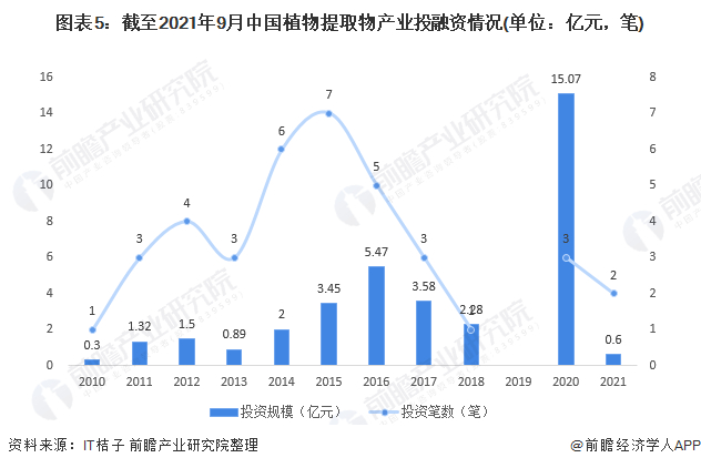 IT桔子数据显示,截至2021年9月,中国的植物提取产业投融资笔数先升后降,投资规模则呈现波动上升趋势,2020年产业投资规模达到15.07亿元,达到近十年来峰值。前瞻通过汇总分析产业投融资事件,得出当前中国植物提取物产业投融资主要集中于医疗健康领域,投资轮次集中于B轮及之前,融资规模从千万元到亿元不等,轮次靠前且规模较大,表明当前产业投融资热情较高,发展前景较好,也侧面印证还没有清晰的定位和完整的标准体系,行业发展迅速但市场尚未成熟。