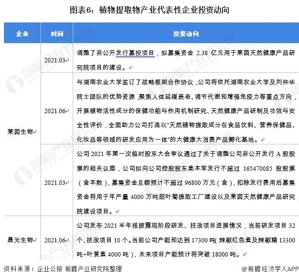 由于产业整体仍处于快速发展阶段,具备明显优势的龙头企业尚未完成形成,前瞻汇总2020年以来业内较具代表性的企业投资动向情况,可得当前业内领先企业通过深耕主力业务,发展伞状产品矩阵的方式以抢占市场份额,主要投资方式包括募资进行产品线建设、项目研发、收购公司拓展业务、通过对子公司增资的方式投资植物提取物生产基地项目等,产业代表性企业最新投资动向如下: